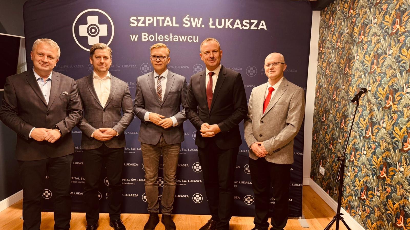 Podczas poniedziałkowej konferencji prasowej w Bolesławcu, oprócz wiceministra Piotra Borysa, obecni byli również starosta bolesławiecki Tomasz Gabrysiak, dyrektor szpitala Kamil Barczyk oraz jego zastępca ds. lecznictwa, Artur Nahorecki i prezes PCK Przemysław Godek.
