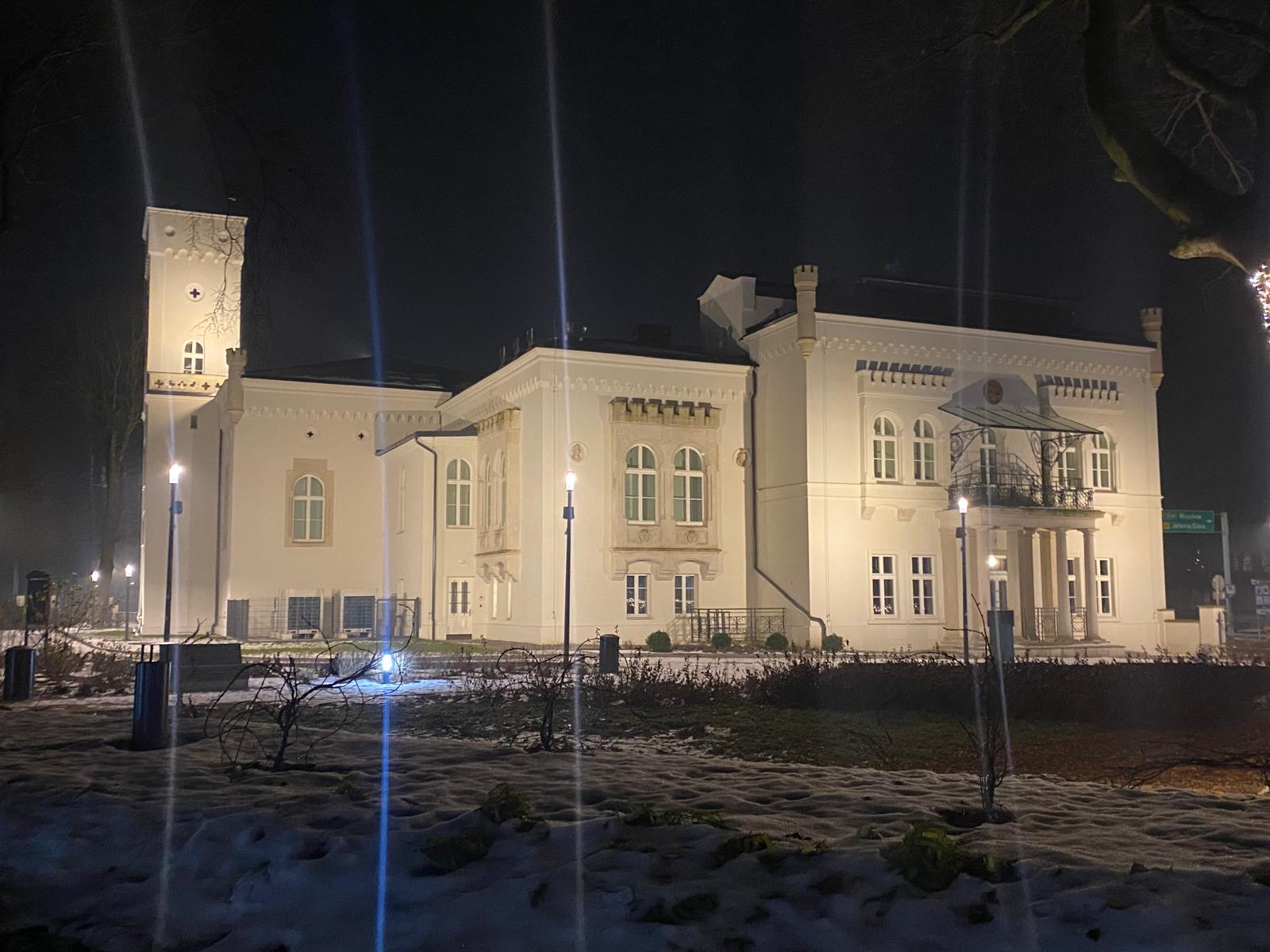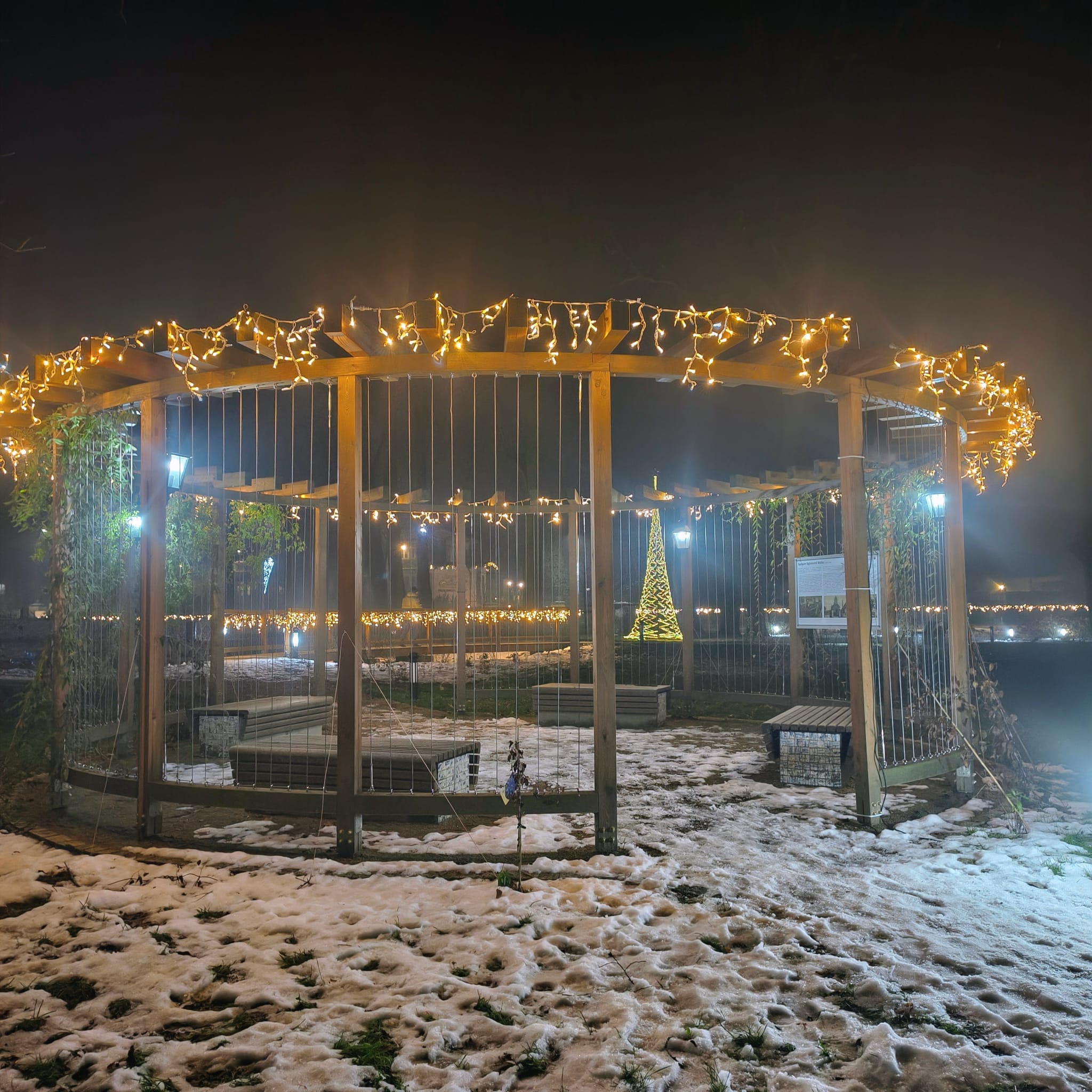 W centrum parku stoi choinka ze świateł. Prosta, bez ozdób, bez bombek, a jednak zachwycająca. Opleciona tylko jasnymi migającymi lampkami wygląda jak świetlista rzeźba wyrastająca z ziemi. Jej blask odbija się na ścieżkach, w kałużach po niedawnym deszczu i w naszych oczach. W oddali Muzeum Ceramiki tonie w ciepłym oświetleniu — jego mury nabierają miękkości, a cała bryła wygląda jak wyjęta z zimowej baśni.